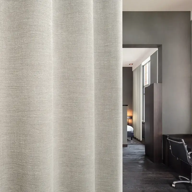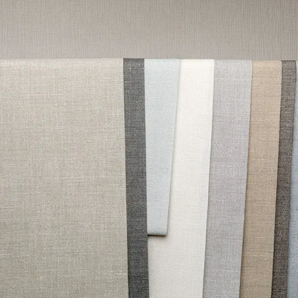 Tessuto per tendaggi acustici con effetto opaco e texture ispirata al lino naturale.