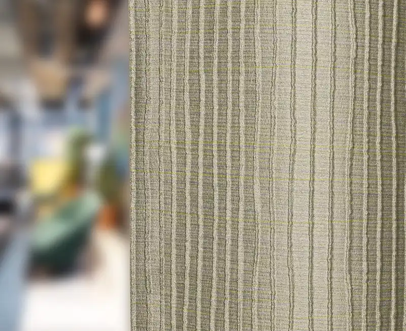Tessuto acustico per tendaggi con struttura a coste verticali, capace di filtrare la luce e migliorare l’acustica degli ambienti.