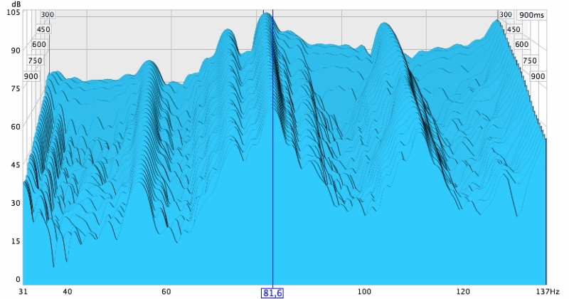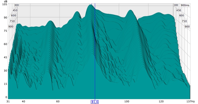 *miglior dato ottenuto dalle ricerche sui materiali in Italia ed Europa **calcolo previsionale in via di analisi Coefficienti di assorbimento αS: 0.00 = 0% di assorbimento 1.00 = 100% di assorbimento Nella tabella sono riportati i coefficienti di assorbimento della sola lana minerale utilizzata da 5 e 10 cm di spessore e misurati secondo le norme EN ISO 354 (A-mount da 125Hz a 4000Hz) come vengono rilasciati dalle ditte produttrici: il materiale viene direttamente appoggiato a terra senza vuoto d’aria (airgap). Le misurazioni dei laboratori, pur essendo effettuate anche in bassa frequenza (sotto i 125Hz) non vengono riportate dai produttori nelle specifiche dei prodotti perchè la norma EN ISO 354 limita l’interesse a una banda tra i 125Hz e i 4000Hz. La trappola completa, lavorata e posizionata in angolo, incrementa le proprie prestazioni in bassa e bassissima frequenza come si può vedere dalle analisi che costantemente effettuiamo sui nostri prodotti sia Broadband (assorbenti su tutto lo spettro udibile), sia a Membrana (con proprietà maggiormente assorbenti in bassa e bassissima frequenza e diffusive in media e medioalta frequenza). Test acustici in situazione reale Qui sotto vengono riportate le analisi effettuate in una sala di dimensioni 6,16m x 2,63m x 2,40m (16,2m2, 38,8m3). Le analisi sono state effettuate con punto di ascolto al 38% della lunghezza maggiore e si focalizzano nel range da 30Hz a 140Hz circa. Il sistema di ascolto è Tannoy SRM 12B Little Red Monitor. Waterfall & Spectral Decay – Confronto Analisi