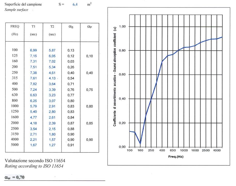 Assorbimento AcusticoUNI EN ISO 354:2003 – G-150 (150mm dalla parete). ฮฑw = 0,70
